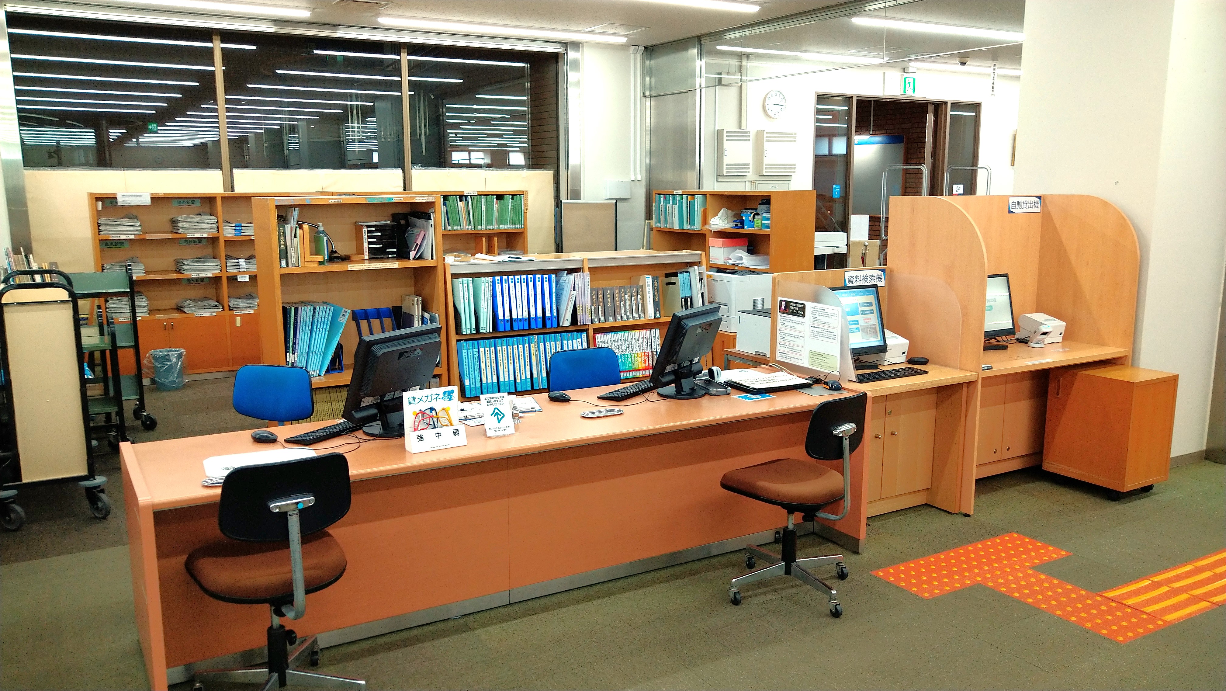 2階のカウンターでは、皆様からのレファレンス(調べ物のお手伝い)を受け付けています。どうぞ、お気軽にお尋ねください。
